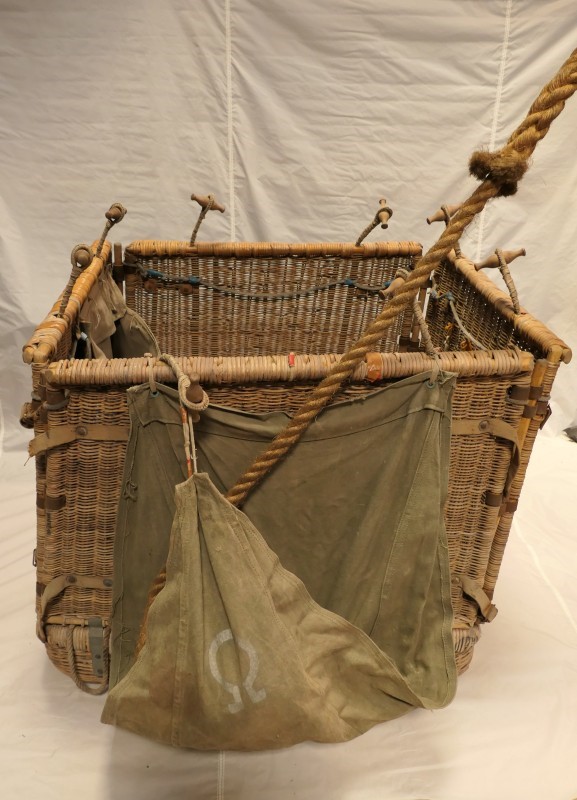 Wartime folding wicker gas balloon basket. Designed to take spies behind enemy lines during World War II, the balloons would be launched off trawlers in the North Sea and the baskets were foldable to save space on the boat.