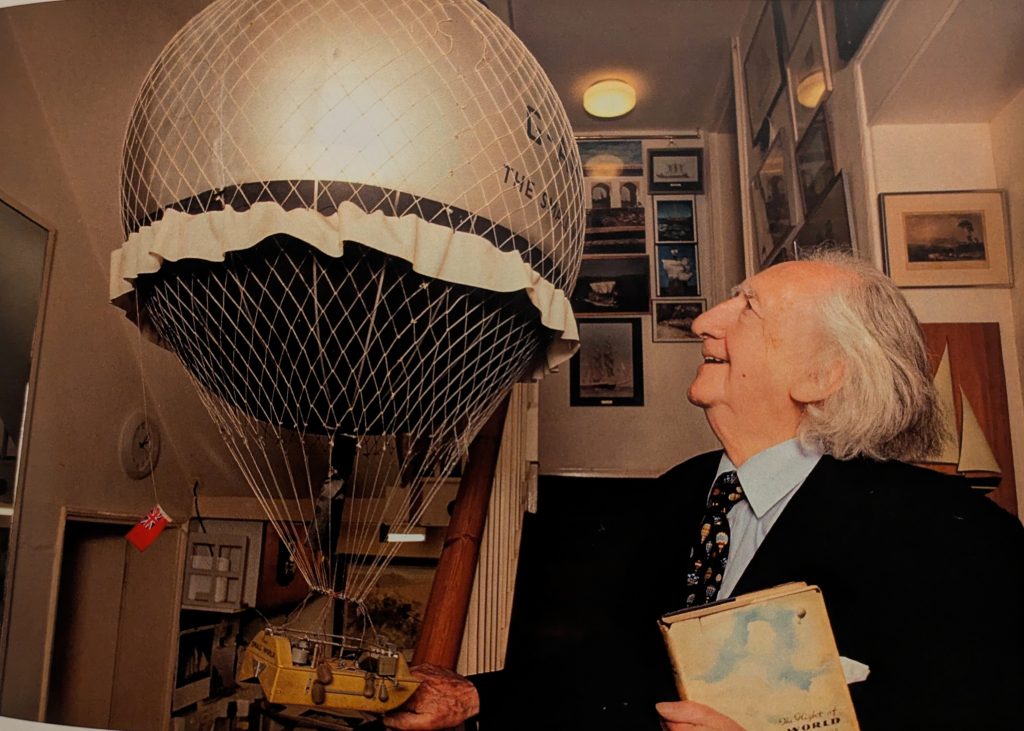 After three years planning it was skipper Arnold “Bushy” Eiloart who learned to fly a gas balloon with Gerry Long when there were no licenced pilots in Britain and it was only after a good meeting with his MP and the Ministry of Civil Aviation that he was advised to interpret the law ‘loosely’ about flying under an instructor.